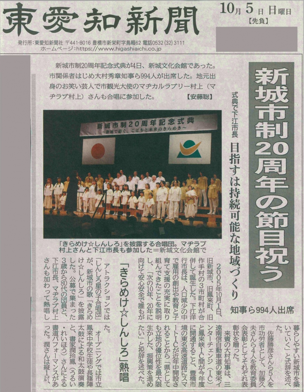 いろいろありましたが、こうして新城市の20周年を記念する新聞紙上に、我が子のように大事な「しんしろ星の子合唱団」が、堂々とトップの写真記事で掲載されていることに感涙を隠しえません。